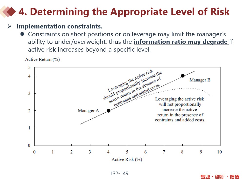 同学,上午好。因为收益是边际递减的(截图),增加n倍的active risk未必就能把active return也扩大相同倍数,因为现实投资中可能存在各种限制。