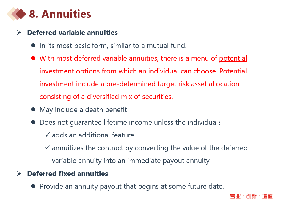 同学你好,关键在于第二点,他要求能够有一系列的投资选项来供他选择。参考讲义,deferred variable annuity是有一个投资选项的清单来供投资者选择的,这个正好就对应于题目的第二点。而deferred fixed annuity就没有这个investment option了,每期获得的年金都是一样的