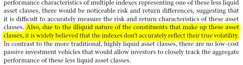 同学你好,B说这些资产大类的指数能很好地代表这些资产大类的特征,那这个肯定是错的,毕竟这些资产是低流动性/高成本的,其构建出的指数也是不准确的,缺乏足够的交易量,很多都是依靠评估值来构建指数,这就会导致这些指数对于低流动性资产的收益和波动率的估测是不准确的。