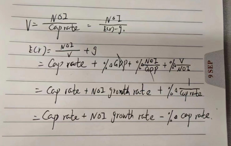 同学你好,这里讲的是预测房地产收益率的公式,如果是预测短期收益的话就要剪掉Δ%cap rate,公式推导如下图。如果cap rate变高,那就意味着房屋的质量要出问题了,比如风险上升,或者NOI增速下降,那么E(R)就下降,说明这些不利的因素导致投资这个房地产的预期收益会降低。如果cap rate在投资阶段下降了,说明房屋的风险降低,或者NOI提高,增速上升,这对于该房屋是有利的,因此如果预期在投资期间内cap rate会下降,就会增加对于该房屋投资的预期收益率。