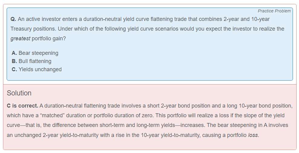 这题的duration-neutral yield curve flattening trade我理解的是投资者预期yield curve变平坦,然后一般都是向上倾斜的,所以变平坦的话策略就是卖短期债买长期债。然后就感觉B最能赚钱。。。。