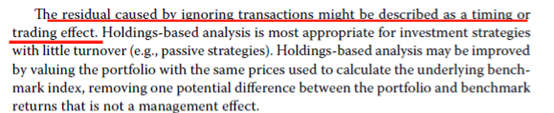 因为基金经理的行为(包括配置和选股)的因素都已经包含在归因分析中了,那么只能解释为在holding based attribution分析期间有交易发生,而holding based attribution无法捕捉交易带来的变化。分析持仓的频率低于实际发生交易的频率。所以R关于holding based attribution的说法是对的。