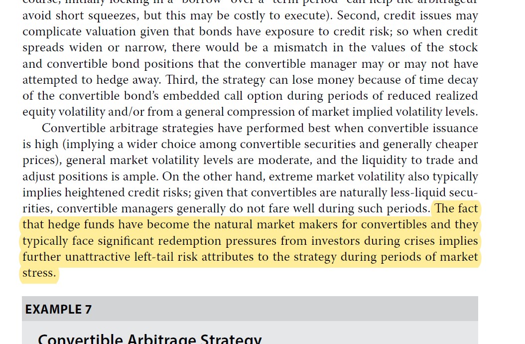 同学,上午好。这个不一定,原版书里只给出了event driven中的merger arbitrage有left tail risk的结论。然后convertible bond arbitrage如果面临crisis时,有left-tail risk。