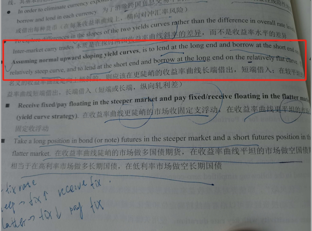 最后我们看笔记中再下一句话,就是说更陡峭的市场应该收固支浮。你认为的矛盾点应该就是说这里。 但这个收固支浮是指的在当前预测收益率曲线变动趋势的情况下,做出的操作,是基于当前的spot rate而言的。 那么预测未来长期收益率增长幅度大于短期,当下就应该增加duration,所以有收固定支浮动的策略。 这里没有涉及长短期的考量,就是即时。