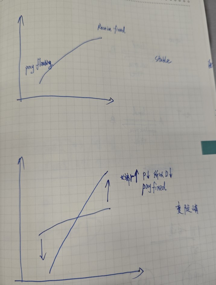 如果收益率曲线发生变动,变陡峭了(有限从长端进行考虑,因为长端久期更大,受利率影响更大),假设长端利率大幅上升,此时要降低长端久期,所以要支固定。也就pay swap。