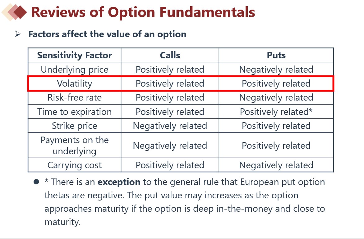 不管是call还是put,他们和volatility都是正相关的,volatiliy越大,call和put的价值就越大(因为波动大了,更可能行权)