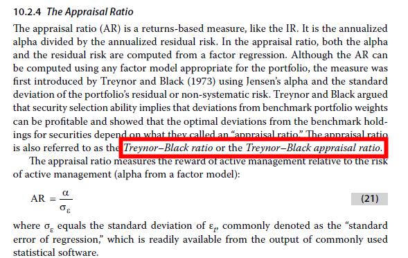 老师,第一题,Treynor-Black ratio 就是 appraisal ratio 么?能发一下关于这些ratio知识点的材料截图么,便于记忆。谢谢。