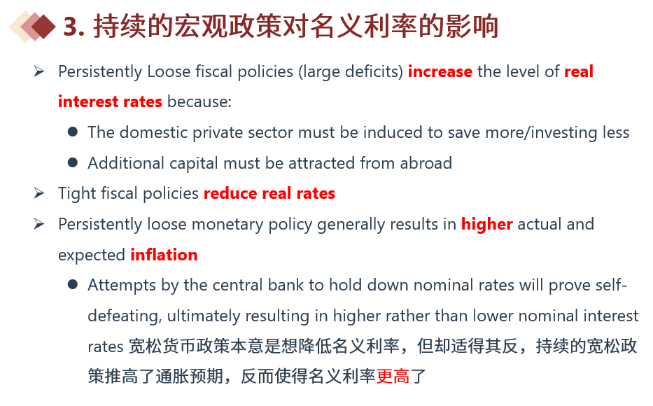 同学你好,可以参考下图的总结。在探讨货币政策和财政政策对名义利率的影响时,要注意各司其职,货币政策影响预期通货膨胀,财政政策影响实际利率,两者结合起来后形成名义利率。如果是持续采用宽松的货币政策,那么最终就会提高通胀以及通胀的预期,不仅没有降低利率,反而最终进一步推高了利率。财政政策是影响实际汇率的,宽松的财政政策推高了实际利率,紧缩财政政策降低了实际利率