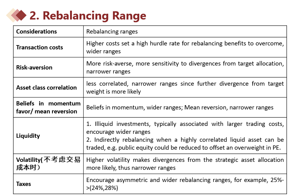 同学你好,rebalancing range是所能容忍的资产权重波动范围,比如在投资组合中,SAA所设定的权益target weight是50%,那就说明对于这个投资者而言,投资组合中权益的权重占50%就是最佳的权重。但是权益价格的变动就会导致权益的market value占组合的权重发生变化,从而偏离当初50%的target weight,于是就会设定一个rebalancing range,相当于是一个容忍范围,如果equity的权重在这个范围内波动就行,万一权重超出这个范围,就要rebalance。而至于这个rebalancing究竟要多宽,则却取决于多个因素,可以参考下图