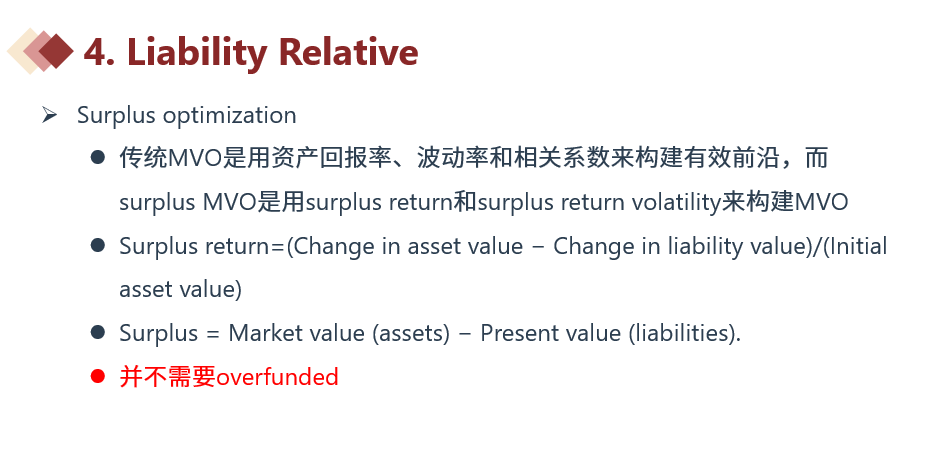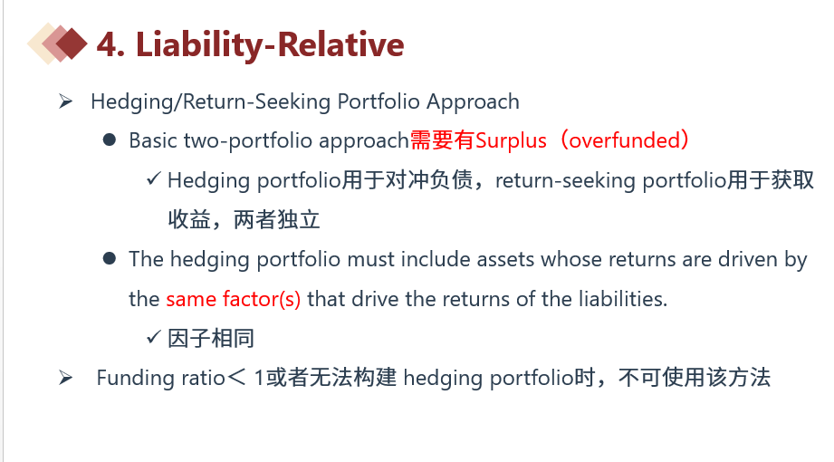 同学你好,可以参考下图总结,要注意surplus optimization是不需要资产大于负债的。而Hedging/Return-Seeking Portfolio Approach是分未basic以及variant两种形式,basic形式是要求资产大于负债的,而variant形式可以在资产小于负债时使用。