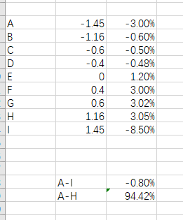 观察A-H,可以发现,return和factor score是正相关的,得分越大,那么次月收益就越高。但是 I,得分1.45,次月收益是负的,不满足A-H里的关系,所以I是异常值。