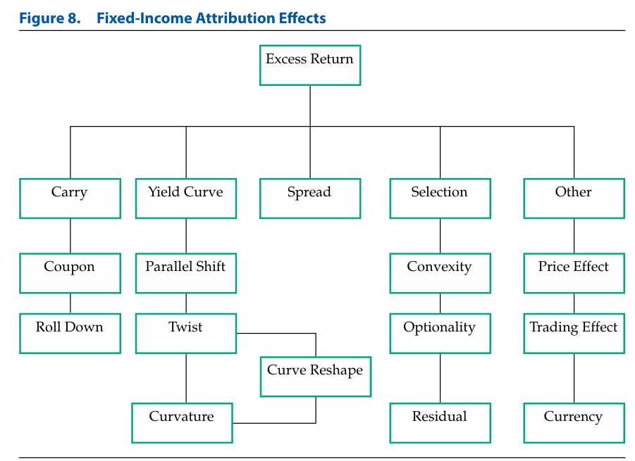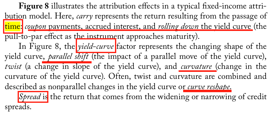 资料中明确了yield+roll是time,shift+slope+curvature这些收益率曲线的变化是curve movement,spread是单独一类因素。