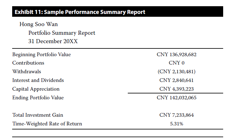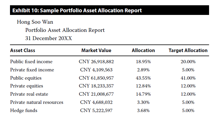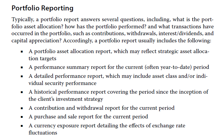 目前他只给了组合中每个单独资产的购入成本、当前市值和盈亏,而没有给出总体组合的情况。原版书给了一个summary report的样板,里面包含了组合当期的总体收益情况,多少是资本利得,多少是股利和利息,以及当期充钱和取钱情况,这个是要包含的,它相当于是个总览。此外allocation report也要包含,能体现出SAA是什么样的。