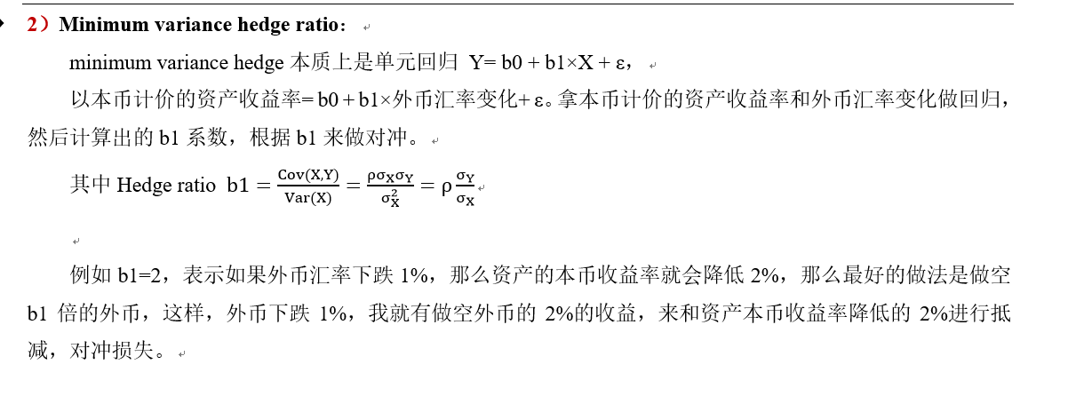 例如b1=2,如果外币汇率下跌1%,那么投资收益(本币)就会降低2%,那么最好的做法是做空b1倍的外币,这样,外币下跌1%,我就有做空外币的2%的收益,来和投资收益(本币)降低的2%进行抵减,也就是对冲损失。