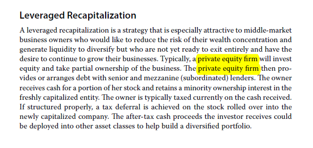 同学你好,平时常说的PE其实就是私募股权基金,也就是private equity fund,而这个PE fund就是Private equity firm用来进行投资的工具。Leveraged recapitalization是企业的拥有者把部分股份卖给PE公司,随后公司主要就由PE公司进行管理运营,随后PE公司会通过加杠杆,用债务融资来获取资本,用这些加杠杆融到的资金来改造公司,进行进一步的投资、扩建、运营。