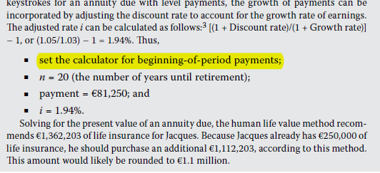 同学你好,在用human life value method以及needs analysis method对保额缺口进行计算时,全部数据都是采用BGN模式结算的,不论是未来每年的开销还是工资,一律都使用BGN进行计算,这个是原版书上规定的,使用BGN模模式来计算目前保额还差多少。这样也能方便计算,至少计算器也不用BGN和END模式来回切换了。