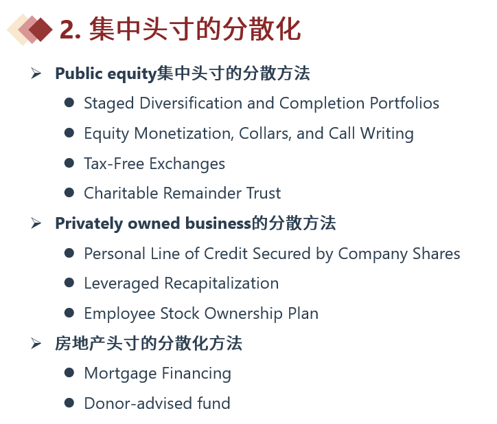 同学你好,可以先看一下课程,这三个选项都是用来对集中头寸进行分散化的。A和B选项都是对Privately owned business进行分散化,而C选项是对public equity进行分散化,那就可以直接排除C了,因为本题是要对自己所创建的公司的股份进行分散化,属于private business,于是就要在A和B中选择。然后参考课程或讲义上的描述,既然要求保留对资产的拥有权,并且还不能有税收,那么就是选B了,毕竟A选项是把部分公司股票卖给PE公司,在收到现金时是需要交税的。