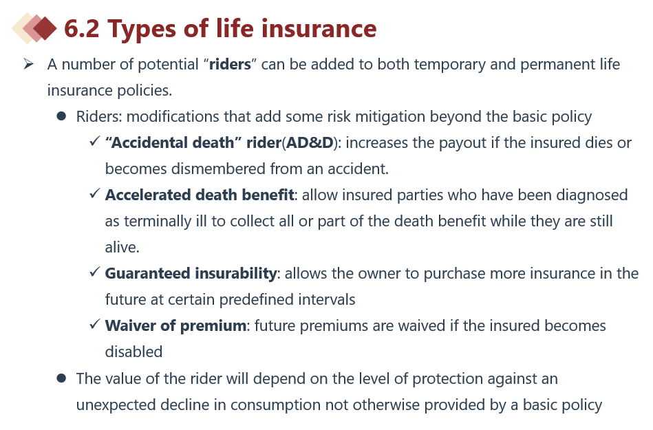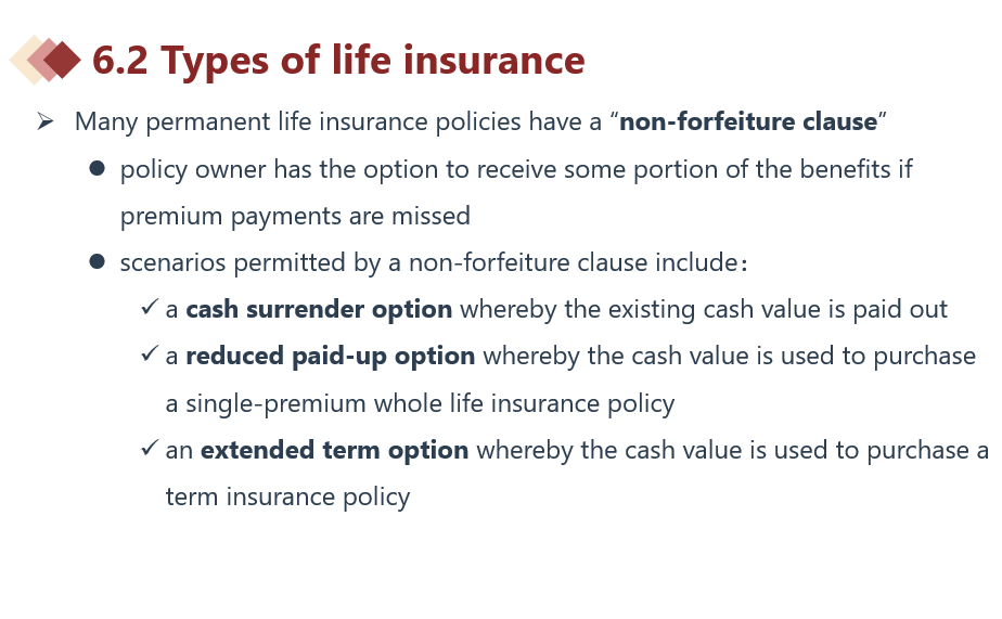同学你好,可以参考讲义上的定义。Non-forfeiture就是不丧失现金价值,无论续保与否,现金价值不变,退保可以退回现金价值。Guaranteed insurability是保证承保条款,在未来一段时间内,允许投保人向保险公司支付更多保费购买更多附加的保额的条款;waiver of premium是如果被保人残疾了,未来可以免交保费。
