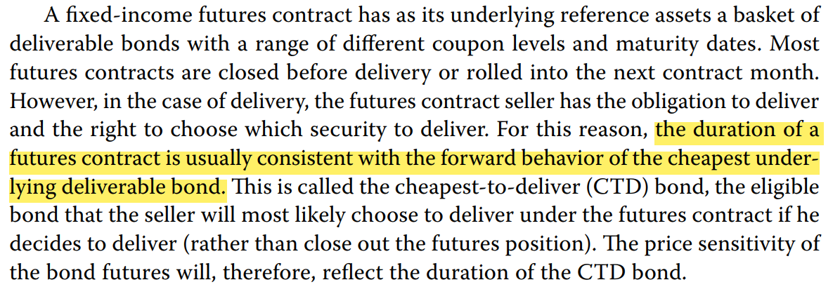 然后CTD债券的duration=标准国债期货的duration。因为在实际交割的时候,用的是市场上真正买回来的CTD bond,如果CTDbond贬值(利率如果上升),那么相应的长期国债期货合约的价格也会下跌,因为P标准×转换因子=Pctd,转换因子是不变的,那么CTDbond的价格变化幅度,与长期国债期货合约价格的变化幅度是一样的,也就是对利率敏感程度一样,也就是久期一样。