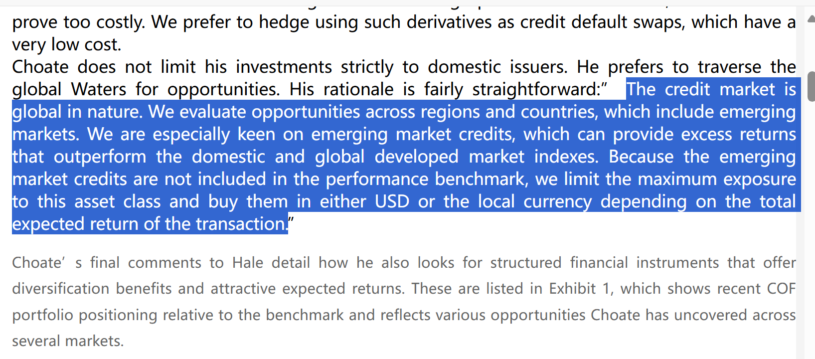 同学,你好,文中说:Choate’s final comments to Hale detail how he also looks for structured financial instruments that offer diversification benefits and attractive expected returns.即C这个人最后对Hala的评论详细介绍了他如何寻找结构性金融工具,这些工具能够提供多样化收益和有吸引力的预期回报。 具体内容参见下图蓝色部分。没有太多有用的信息,做题主要看exhibit 1.