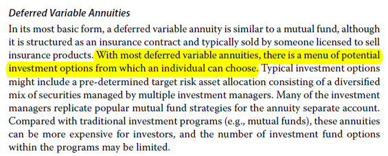 同学你好,ALDA它并不能提供多种投资标的,它就是当投资者年纪很大(比如85岁)的时候开始才发放年金的。能够提供potential investment option的是Deferred Variable Annuities
