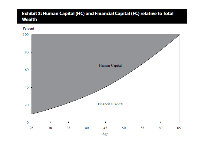 同学你好,文中说一个处于职业生涯中期的人的human capital占总财富水平的比重会比处于职业生涯早期的人要高,这个说法是错的,随着年龄的上升,financial capital的比重在上升,human capital的占比在下降,因为human capital是未来所有收入的现值,年轻人未来收到工资的期数会很多,所有未来收到的工资的现值是肯定大于中年人的。
