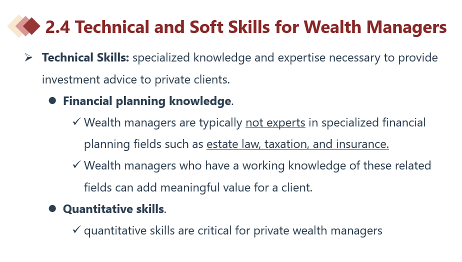 同学你好,可以参考讲义截图。财富经理需要精通资本市场,但是不需要成为某个板块或证券的专家,那是股票分析师的任务。财富经理也要有财务规划的知识,但是他们通常不会是诸如遗产法/保险/税收等特定方面的专家,所以财富经理是通才,而不是某个单一领域的专才。