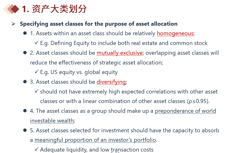 同学你好,是否达成分散化,这是要取决于资产大类间的相关度的,要是相关度很高(大于0.95)则不满足分散化,相关度不高则满足分散化。由于文章中没有给出相关系数或者对相关度高低做描述,我们也就无法从分散化这个角度去判断了,不能自行假定这些资产大类的相关系数很高。