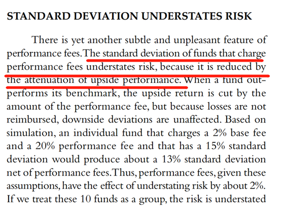 如果我们用net active return(扣除费用后的active return)的标准差来评估组合的风险,会低估组合的风险。在业绩差的时候因为基金经理不会分担亏损,因此下行波动率不受影响,在组合业绩较好的时候,因为收取了业绩提成,业绩的波动性降低了,导致整体的业绩的标准差是偏低的。