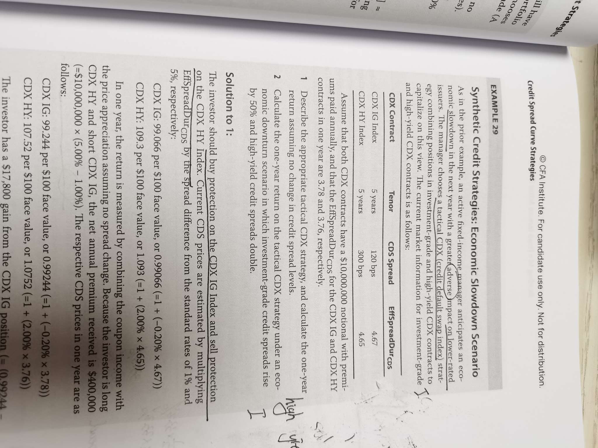 reading 14的example31中,credit curve steepen,长端spread上升得多,风险大,买保护,所以是对10年买保护,对5年是卖保护,麻烦问下这种思路是正确的吗?nnn到了example29中,经济slowdown,低利率债的负向影响更大,意味着负利率债的风险加大,买保护,而题目给出的策略是对投资级买保护,这是为什么呢?我的解题思路错了?