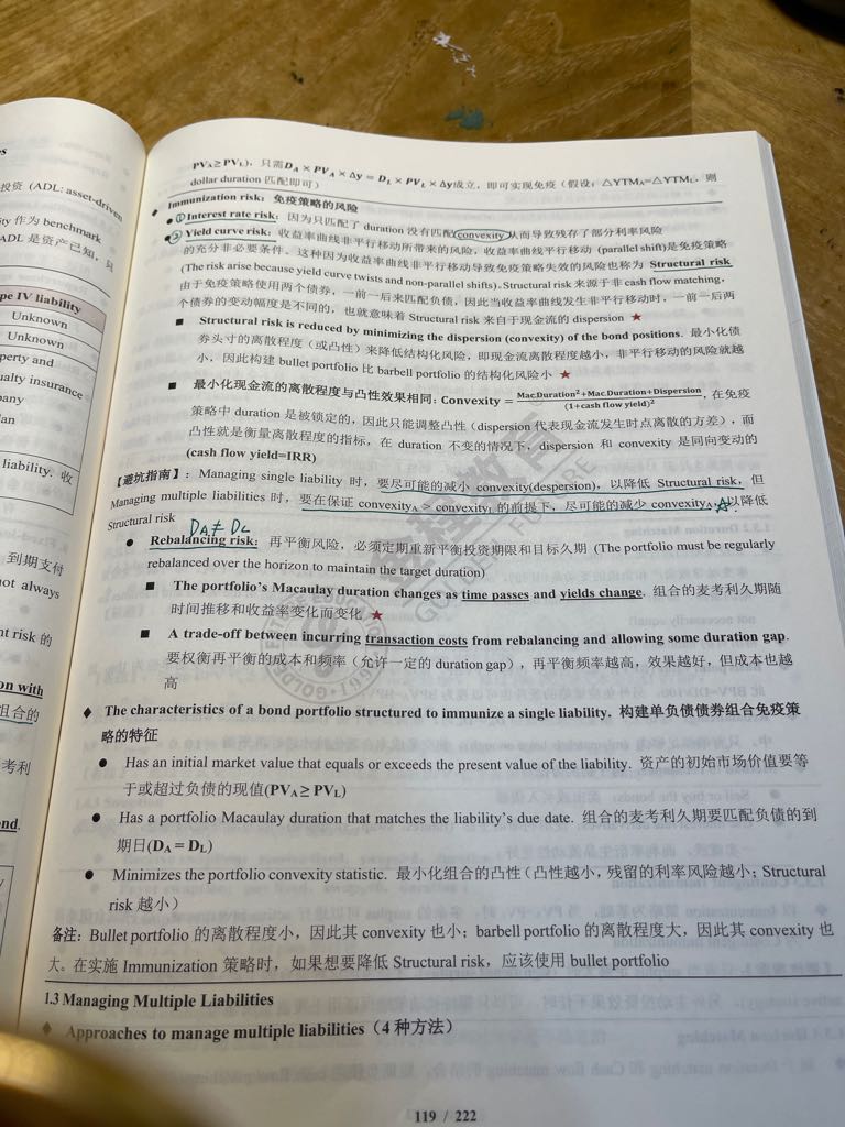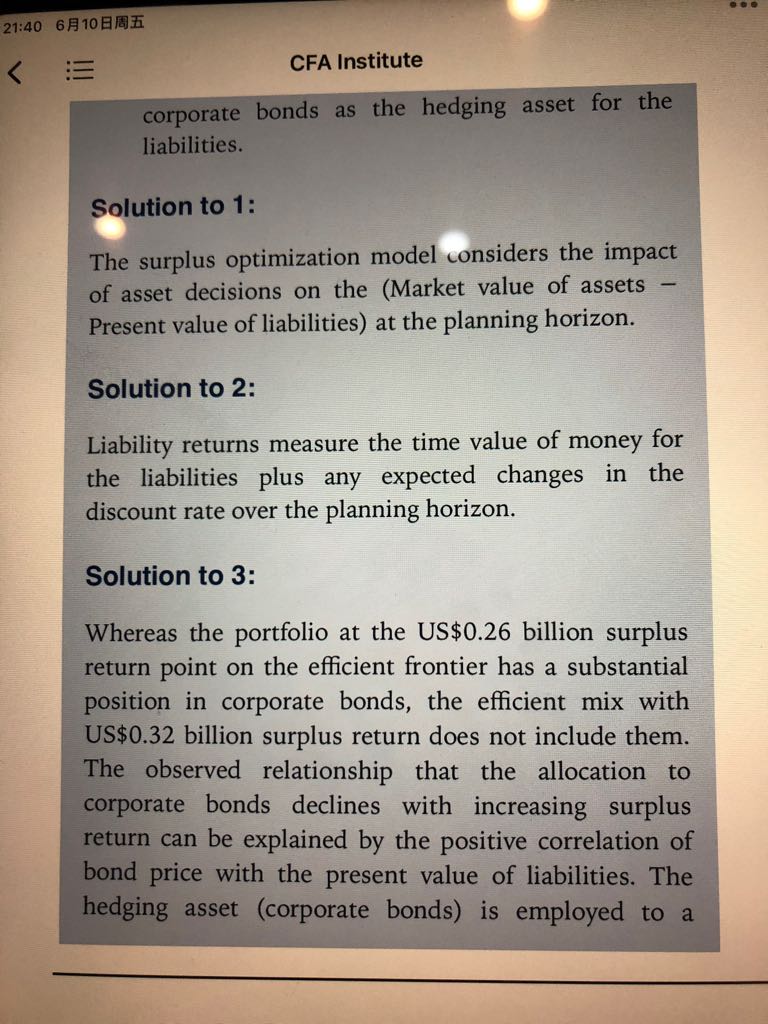 已回答AA原版书 411页,Example 4 C C Maintain the current asset allocation of 95% bonds and 5% global equities, but increase the duration of bond investments. 答案中解释:it may result in a modest improvement in the expected return on assets if the yield curve is upward-sloping. 如果利率曲线上升,债券价格下降,久期越长,价格应该下降越多;为什么会出现modest improvement in the expected return on assets呢?