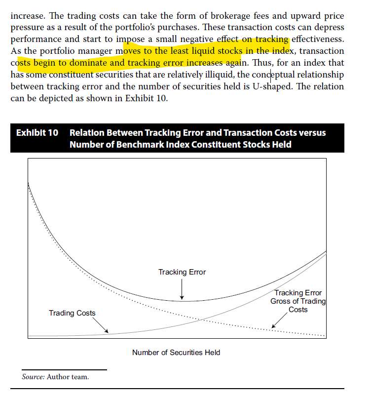 已回答L3V3 P202. I'd like to ask something about the tracking error and transaction cost. (1) If the tracking error measures the divergence in portfolio price and benchmark price, does that mean whatever causes the price difference could affect the tracking error? (2) In the diagram, why is the "tracking error gross of trading cost" continuously declining when both tracking error and transaction cost are increasing? (3) How to guarantee a convex U-shape but not a concave U-shape? If the first security purchased for the portfolio is illiquid, then transaction cost dominates and tracking error should increase.