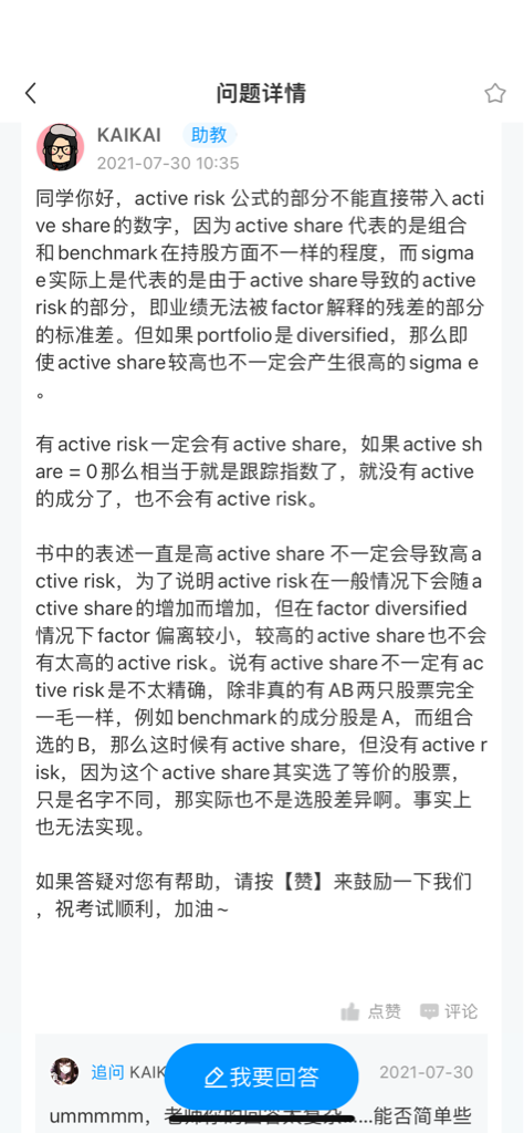 关于active share和active risk,我对这个回答还是有点懵…怎么理解有active risk一定有active share呢?我理解,解答是想说如果active share=0,是不是就代表active factor risk和specific risk都是0了?根据active share的定义,sizing和number是影响它的因素。active risk中factor部分就对应sizing,specific就对应股票的数量么?