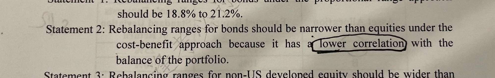 已回答老师好,想问一下statement2 答案说是对的。是不是错了呀? 相关性低 不会同涨同跌 波动大,不考虑cost情况下,range应该窄,但这题不是要考虑cost吗?所以波动大 range不是应该宽吗