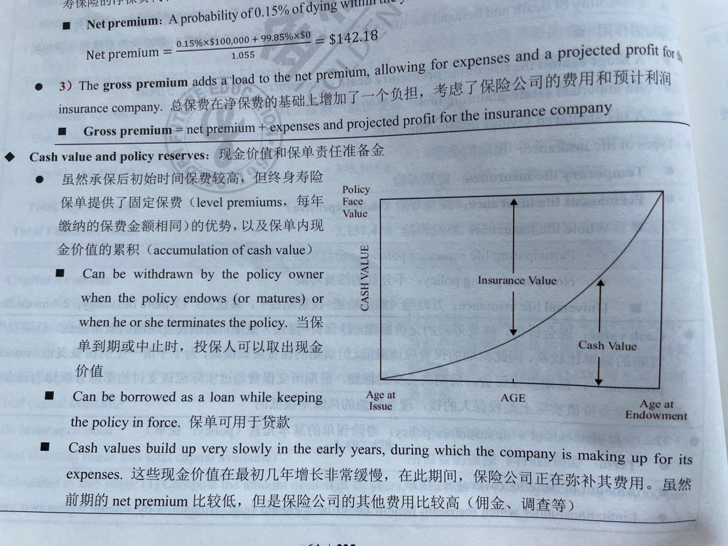 保险这部分insurance value是什么?和net premium,gross premium什么关系呢?一开始net premium低,按理cash value应该比较高,但由于保险公司的其他费用,占用了cash value的金额,所以cash value才显得小吧?但是这张图显示,age at endowment,cash value反而更大了,这怎么理解?原则上,年纪越大,应该保费多,现金价值小才对吧?