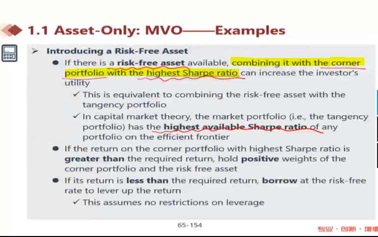 课件描述中简单地选取sharpe ratio最高的corner portfolio与risk-free点做组合,对此存有疑问。sharpe ratio最高的点,与risk-free点的连线的斜率却不一定是最大的(如图3中A、B两点,A的sharpe ratio较高,但与risk-free点相连后斜率较低),实战中以何为准呢,是否不能凭借corner portfolio单独的sharpe ratio做判断,而是应该先计算斜率。