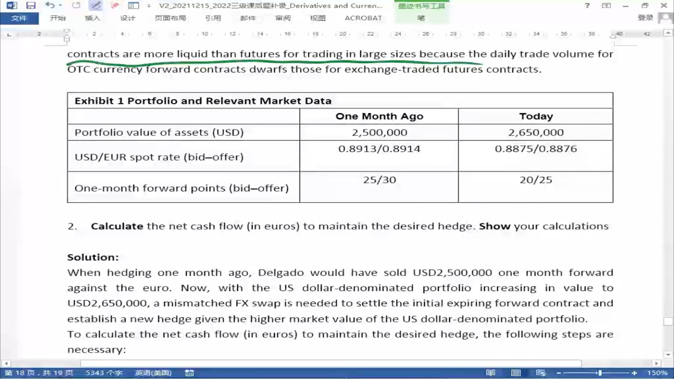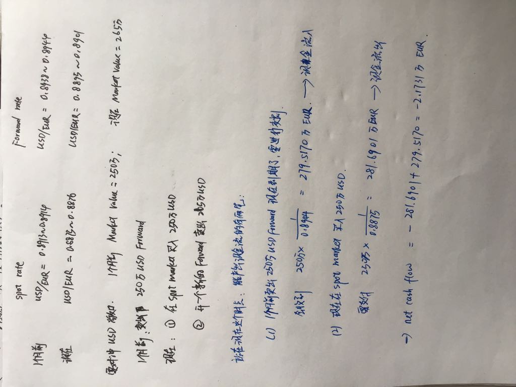 这个题目的现金流还是有点问题,1个月前开的远期合约现在到期了,现在要做的事情首先应该是将一个月前的合约进行平仓,具体是怎么操作呢?不涉及交割吗?我的理解是有两个步骤,一是把之前开的远期进行交割(因为一个月前约定卖美元现在来交割就是卖美元收到欧元)。 二在现货市场买入250万美元,要支付欧元,这样一收一支就产生了净现金流,不是吗?具体见下面图片