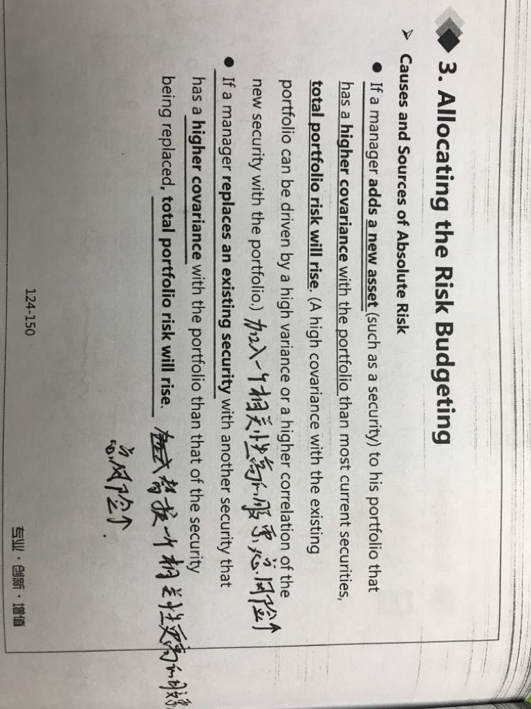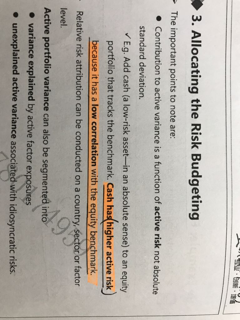 老师:为什么用一个相关性更高的股票replace an existing security会使组合的风险升高?(难道不应该使active risk 更小吗?冲刺笔记中说道:减持一只银行股而增持另一只银行股可能比减持一只银行股而增持一只信息股的active risk更小。);现金与组合里股票的相关性低,add cash为什么使active risk 变高?
