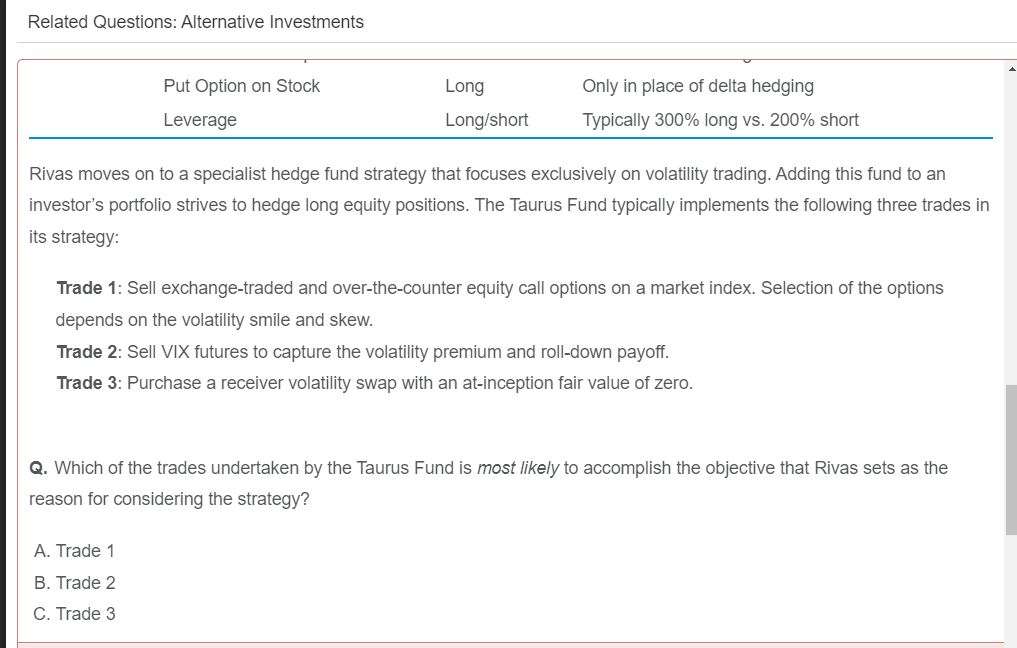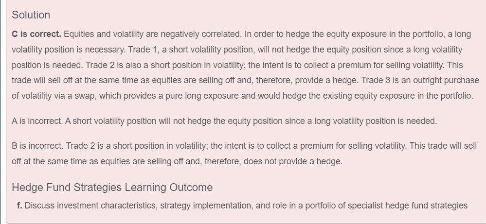 老师您好,请教这道官网题,1. receiver volatility swap 是什么意思?与payer volatility swap相比,receive 和pay 的对象是什么呢? 2. 我的理解是这样的:因为long equity position已经承担了 equity price volatility, 所以要 short volatility 对冲,所以选B。 看看这个思路错在哪里呢。谢谢