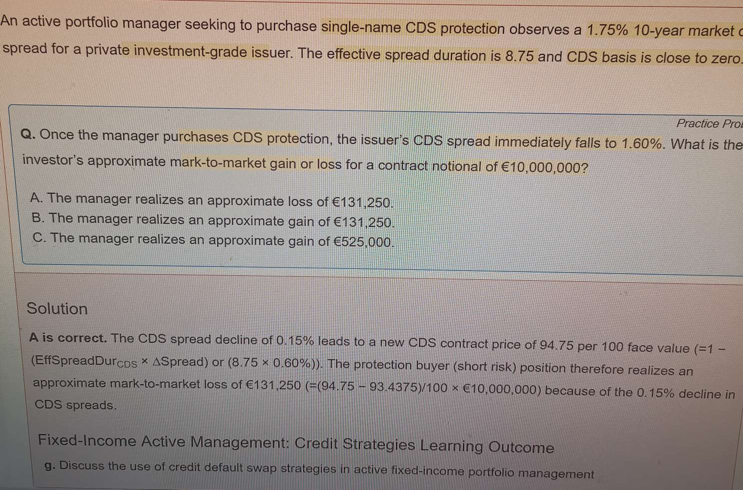 这个数字很容易算出来,spread的变化x effdur x contract notional 就可以了。关键是判断方向,因为bond是spread跌 价格涨 cds是bond的保险 正好和bond变化反向 所以spread跌 cds跌 所以是loss。这样理解对吗?