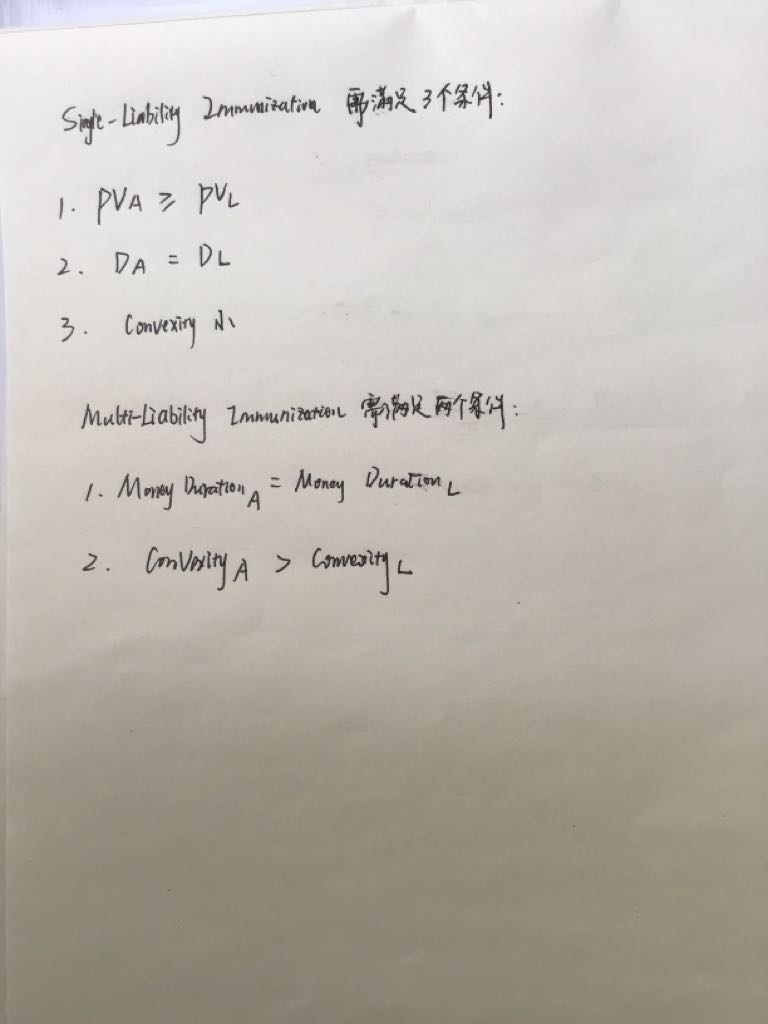 关于LDI ,债券免疫需要满足的条件如下图,对吗?有几个问题,第一,单一债券免疫的条件能改成money duration 匹配吗?第二,多个债券免疫的条件里面,资产和负债的market value可以不等,麦考利久期也可以不等,cash flow yield 也可以不等,只要money duration 相等就可以?