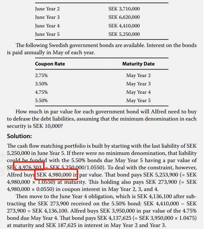 老师,固收原版书R12例题3,这里用cash flow matching计算par value, 比如第五年的,为什么计算到是4,976,303,但最后却用了4980000呢?其他年份的也都是取到万整数了,这是有什么规定吗?