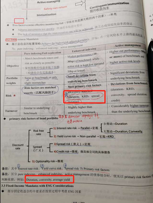 老师,关于enhanced index 和active mgt的判断,有几个问题:1. 固收百题CASE 1Q1里写到duration slightly 和benchmark不同,该题答案判定为act mgt,但冲刺笔记这里写到primary factor只要closely match,我理解是可以略微有些不同的,为什么百题里这题就判定是act mgt了呢? 2. 具体有哪些primary factor是要close match, 有哪些primary factor是要100%match才能算是enhanced index? 3. 冲刺笔记框起来部分写的primary factor上下不一样,具体哪些算是primary factor?