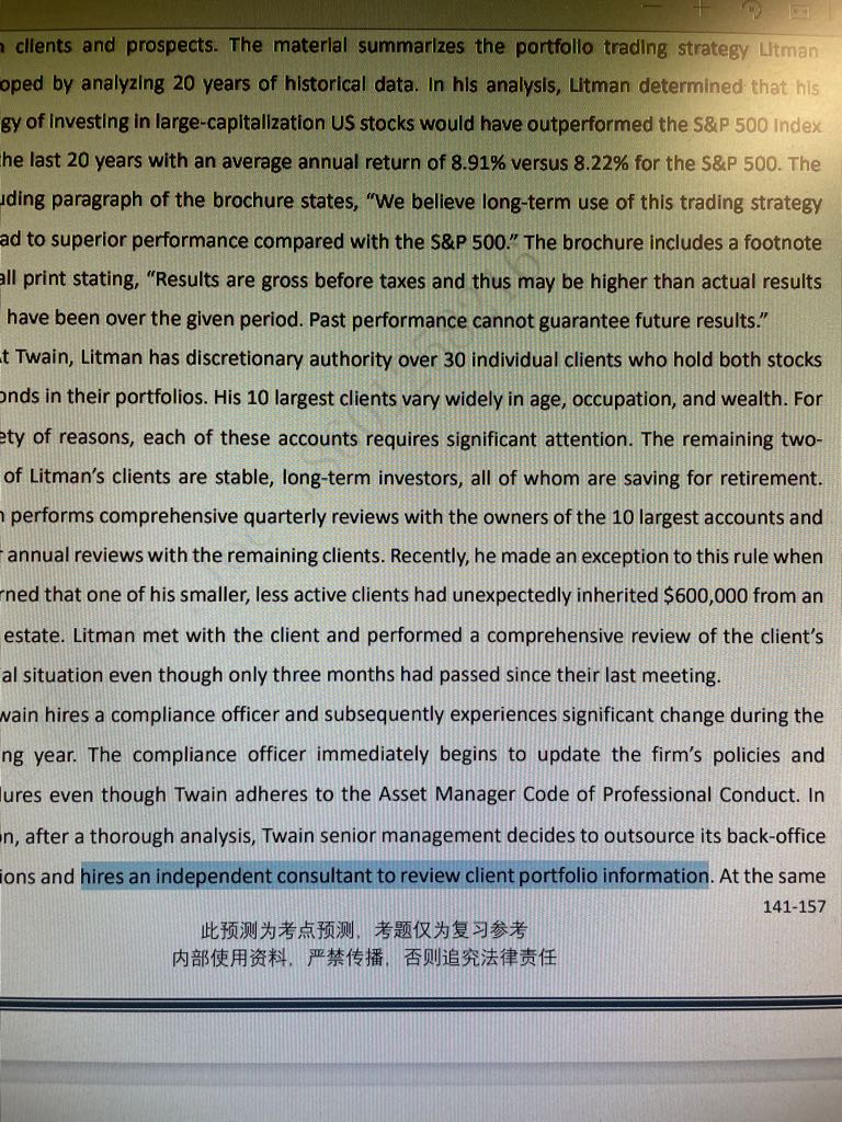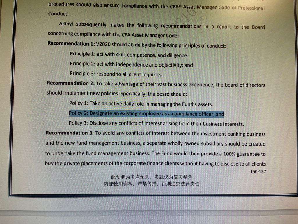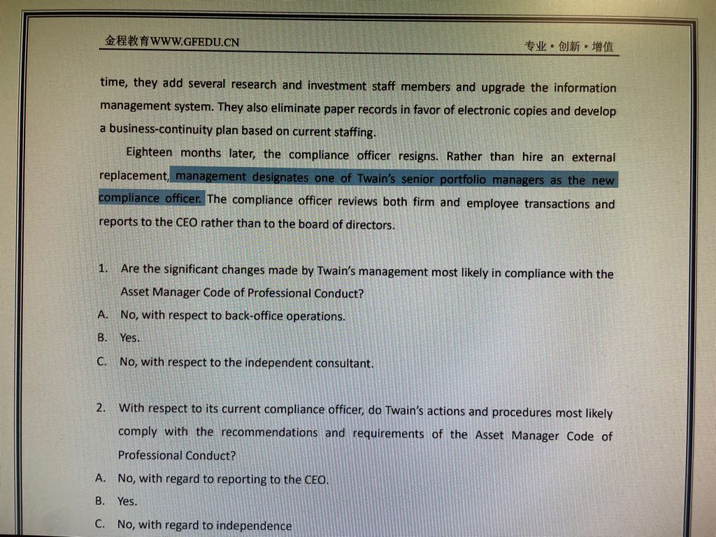 已回答老师,为什么Frank Litman的案例中“management designates one of Twain's senior portfolio managers as the new compliance officer”由于影响了独立性所以做错了。而Vision 2020的案例中“Designate an existing employee as a compliance officer”就是对的。我听了Bob老师的讲解,两个案例的动词都是designate,为什么前者是“兼职”,后者就不是“兼职”?在考试里遇到这样的表述,我该怎么办?