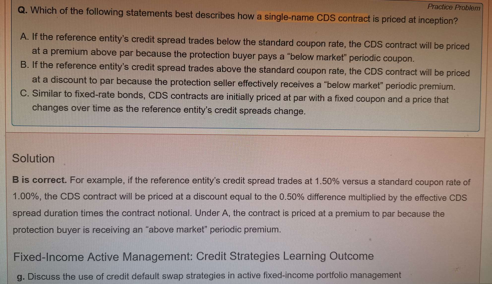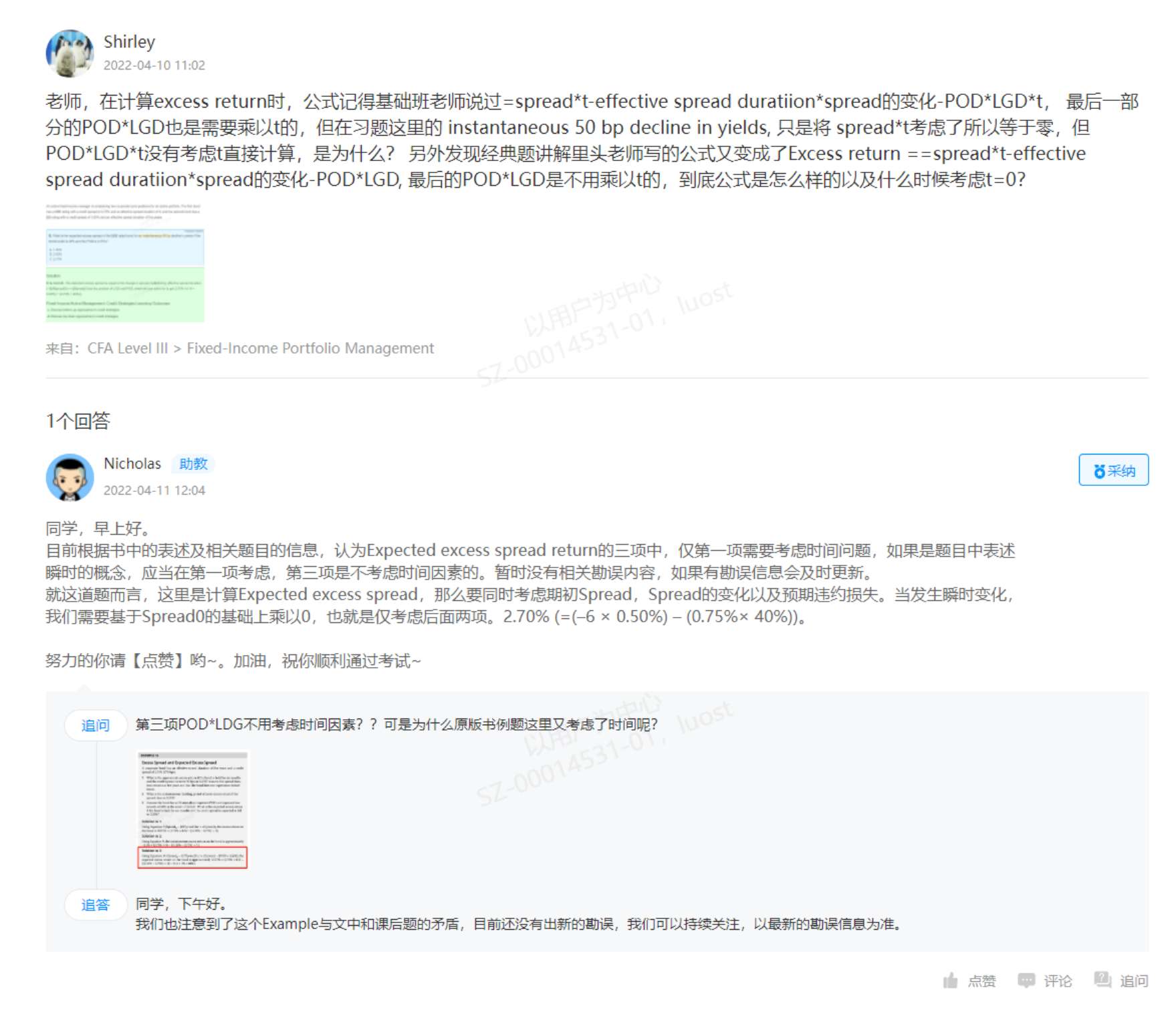 老师,固收百题Case 6 Q1, 这里题目说了是instantaneously decline, 那不是要在spread 0和POD*LGD项都考虑t=0吗?为什么这里都没有考虑?前面也出现过几次这个t在不同地方(如图三)的计算标准不一样的情况,回答的说法也都是不一,到底考试时要怎么处理?能否给一个确定的标准?!!