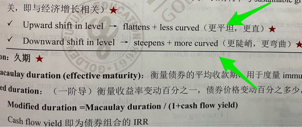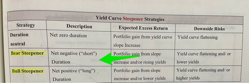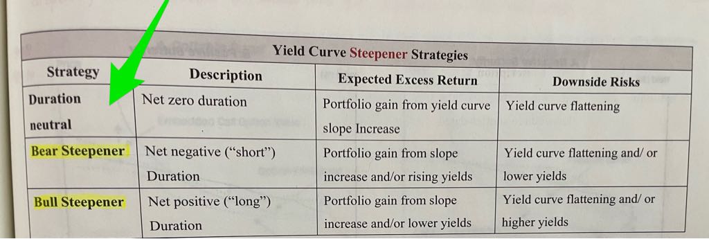 老师,冲刺笔记上册133页最上边表格yield curve steepener strategies的duration neutral是不是应该理解为收益率曲线的转动(即短期利率下降,长期利率上升,中期利率基本不变),而不是收益率曲线整体向上(如bear steepener)或者向下(如bull steepener)。此时,应该做多短期债券,做空长期债券,并保持duration=0。请问我理解的对吗?
