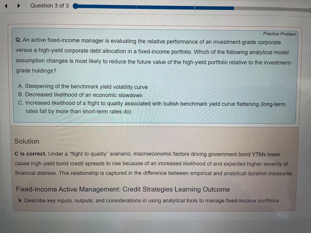 老师,为什么bullish benchmark yield curve flattening会导致flight to quality?另外,这道题为什么不选A?谢谢