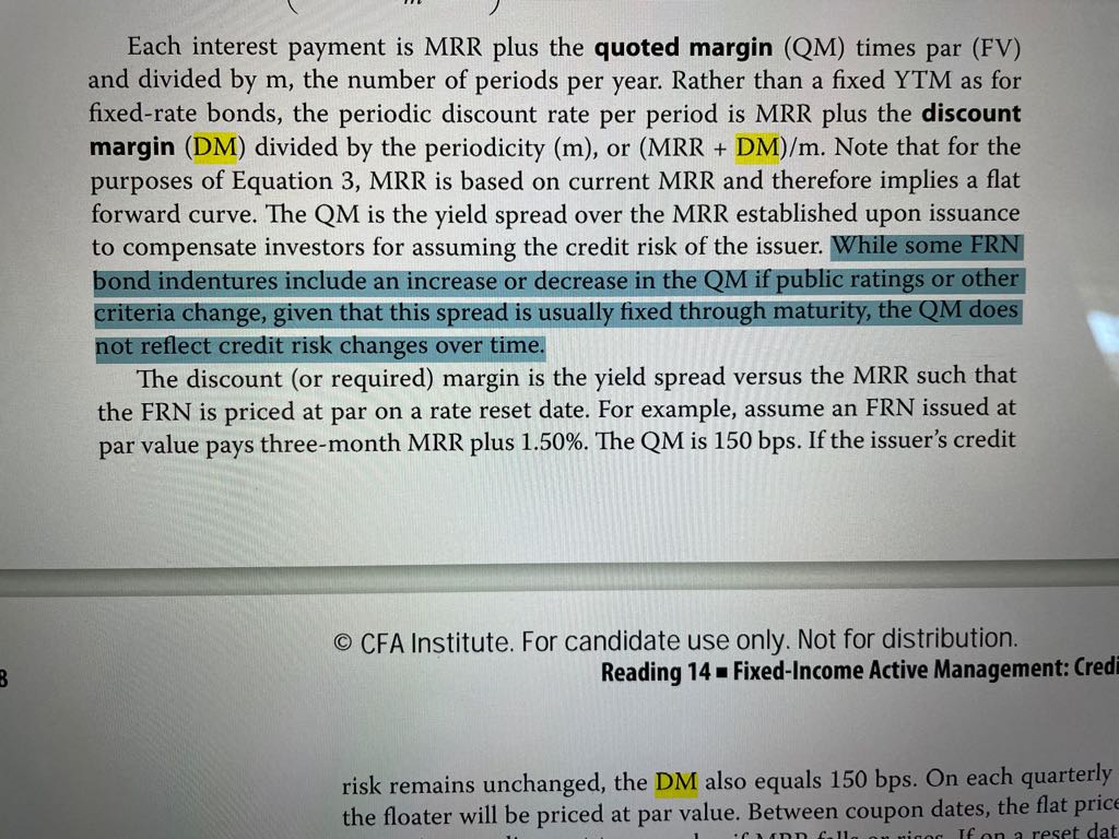 老师,QM will be above DM if issuer creditworthiness improves. 这句话是说评级上调后,因为折现率DM会下降,而不是因为QM会上升(QM在债券发行后是不会变的)。对吧?