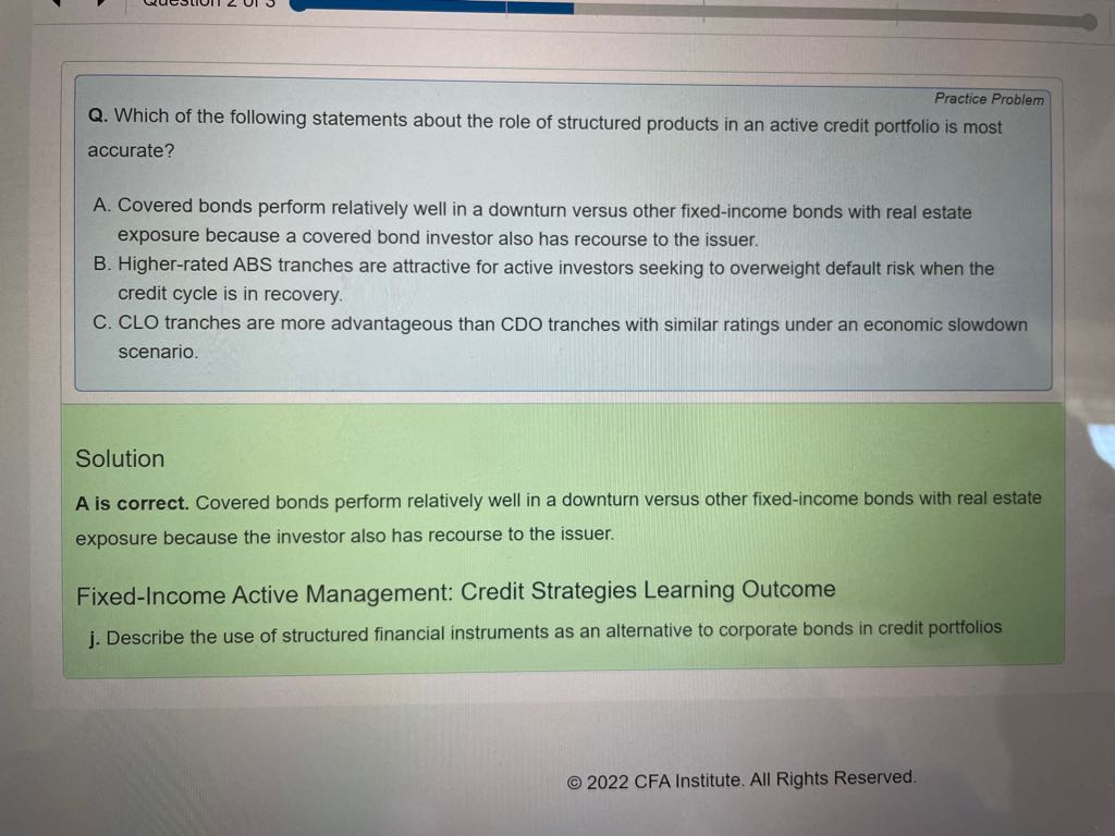 老师,这道题B之所以错,是不是因为投资者在经济复苏时应该买差一些的资产,而不是higher-rated ABS? 另外,C之所以错又是为什么?在经济衰退时,CDO与CLO有什么不同?