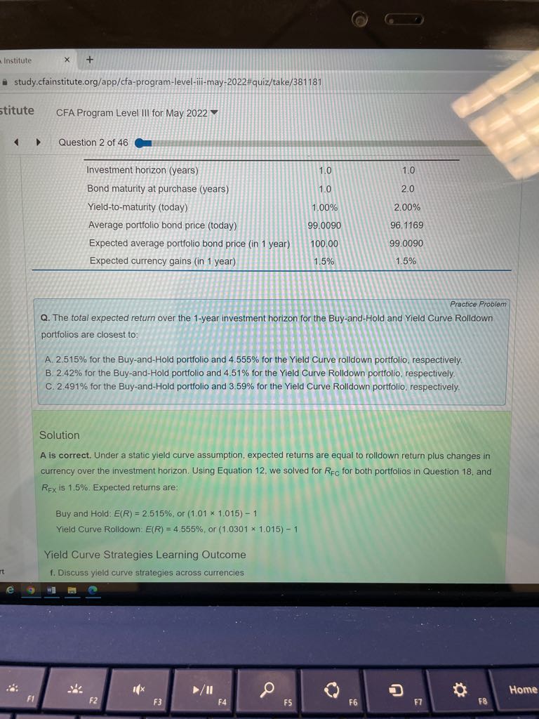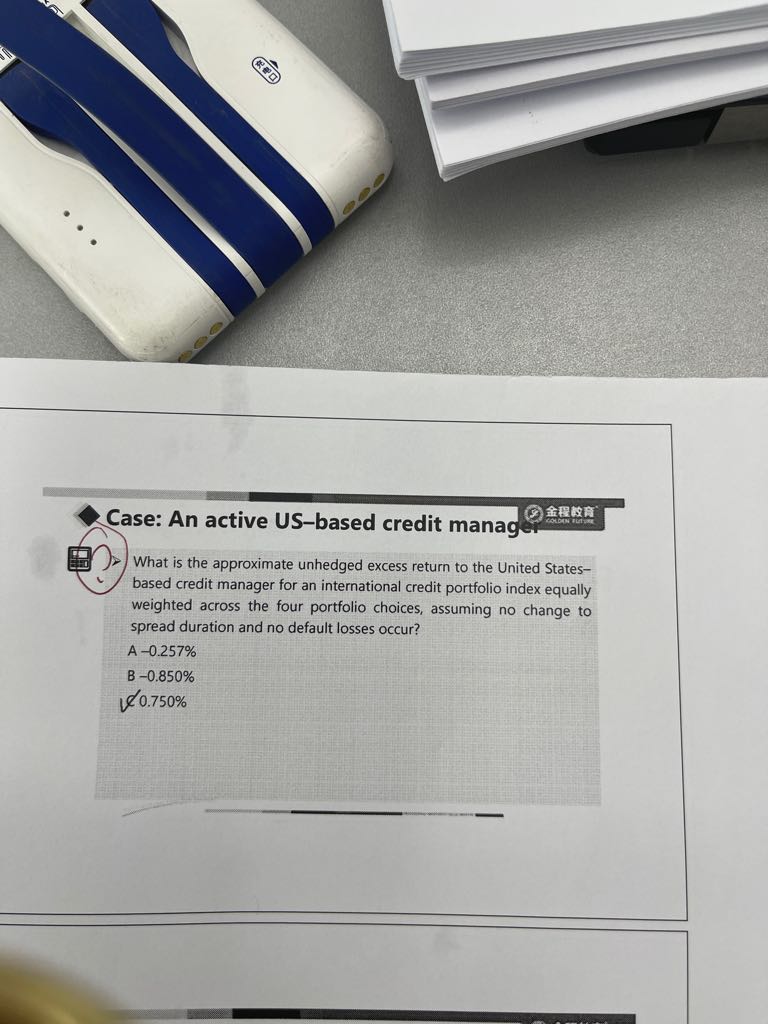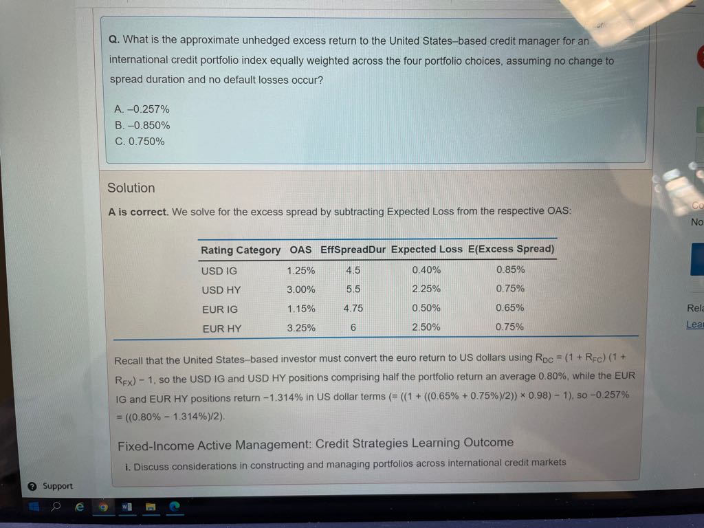 老师,这道题我有两个疑问:1.题目不是说no default losses occur吗?为什么要减去expected loss ? 2.在计算0.8%和-1.314%时,为什么要除以2(而不是除以4)?谢谢老师